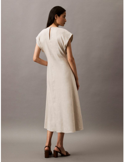 Côté matières, cette robe est composée à 54 % de lin, 44 % de viscose (SCV) et 2 % d’élasthanne. Ce mélange soigneusement choisi assure une texture légère et respirante, idéale pour les journées où l’on souhaite rester fraîche sans sacrifier le style. Le lin apporte une sensation naturelle et authentique, tandis que la viscose confère douceur et fluidité au tissu. L’élasthanne, quant à lui, offre une légère élasticité qui accompagne chaque mouvement avec aisance, renforçant le confort global de la robe.