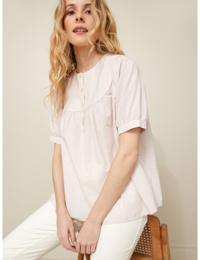 Conçue pour allier confort et esthétique, cette blouse légère s’adapte à toutes les occasions, du bureau aux sorties décontractées. Sa coupe fluide valorise la silhouette tout en offrant une liberté de mouvement optimale. Le motif mini carreaux apporte une touche graphique subtile, facile à associer avec un jean ou une jupe unie.