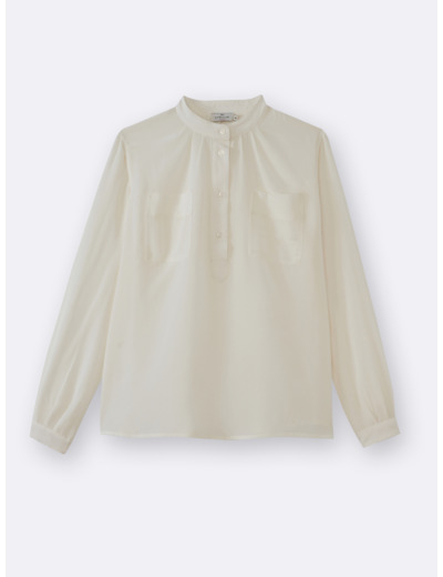 Fabriquée en soie 100%, cette blouse présente une coupe droite avec un col classique et des manches longues légèrement évasées. Elle se ferme par des boutons discrets sur le devant, assurant une élégance sobre et fonctionnelle. Disponible en plusieurs tailles, elle répond aux exigences d’un vêtement de qualité, pensé pour durer.