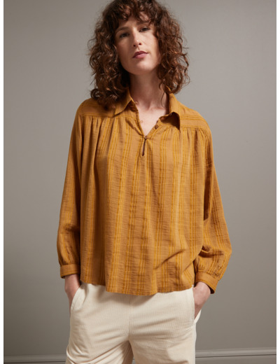 Tissu fluide en polyester et viscose avec motif dobby, col classique, manches longues avec poignets boutonnés, fermeture par boutons discrets sur le devant. Coupe droite légèrement ample pour un confort optimal.