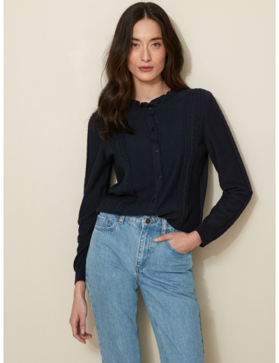 Fabriqué dans un tissu de qualité, ce gilet présente un col froufrou délicatement travaillé et une coupe ajustée. Entretien simple, il conserve sa forme et sa couleur lavage après lavage.