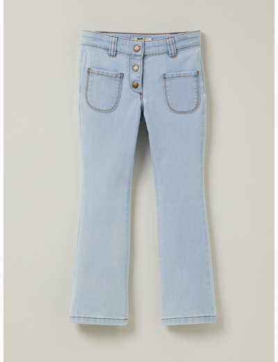 Jean en denim 100% coton, coupe flare, taille ajustée avec fermeture zippée et bouton, disponible en plusieurs tailles pour filles. Entretien facile, lavage en machine à 30 degrés.