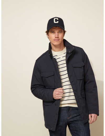 Confectionnée dans un tissu technique résistant à l’eau, cette parka dispose de quatre poches extérieures avec fermetures sécurisées, d’une fermeture zippée avec rabat pressionné et d’une capuche ajustable pour une protection renforcée. Sa coupe droite facilite les mouvements tout en conservant une ligne élégante.