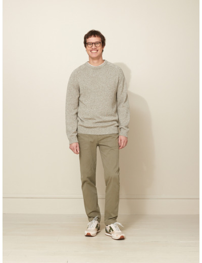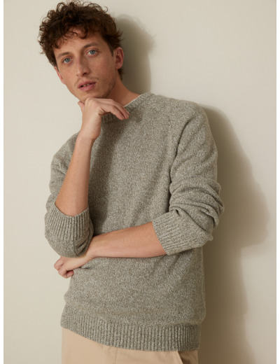 Réponse : Le pull est confectionné dans un mélange de fibres naturelles et synthétiques pour un équilibre optimal entre confort et résistance.