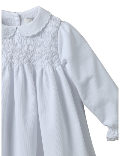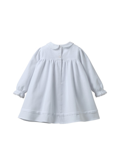 Réponse : La robe est confectionnée dans un tissu doux, respirant et résistant, idéal pour la peau sensible des bébés.
