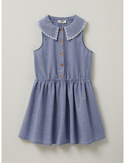 100% coton chambray, lavage en machine à 30 degrés, séchage à l’air libre recommandé. Disponible en plusieurs tailles adaptées aux filles de 2 à 10 ans. Coupe droite, encolure ronde, sans manches.