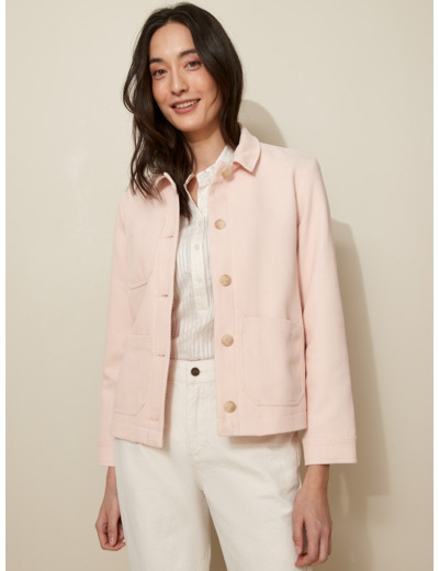 Réponse. La veste est fabriquée en twill de coton mélangé, garantissant résistance et confort.