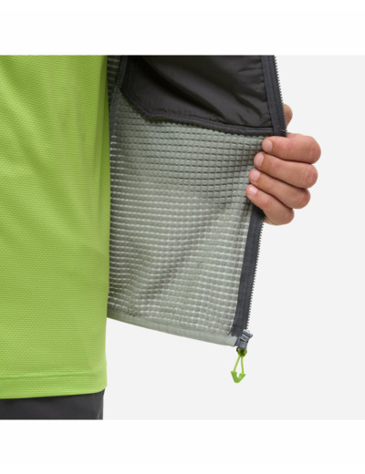 La matière principale est un polyester 100% recyclé LIGHT AIR RIPSTOP avec un traitement déperlant durable DWR sans PFC. La matière secondaire est une polaire MICRO GRID FLEECE également recyclée, garantissant respirabilité et confort.