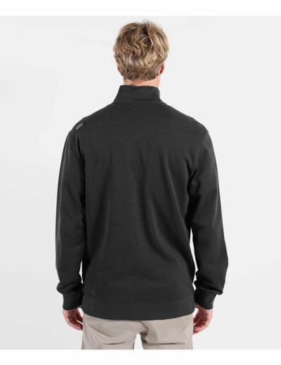 Cette veste noire est réalisée en french terry écologique, un tissu doux et respirant qui allie 50% de coton, 30% de coton recyclé et 20% de polyester recyclé, offrant à la fois confort et respect de l’environnement. Le textile présente une texture intérieure moelleuse, parfaite pour conserver la chaleur sans surcharger. Sur la poitrine, un graphisme spiral brodé apporte une touche subtile et distinctive, reflétant l’identité de la marque OXBOW avec discrétion et élégance. Deux poches avant complètent ce modèle, pratiques pour garder vos mains au chaud ou ranger vos petits objets essentiels.