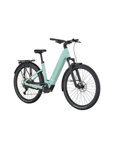 Il dispose d’une fourche SR Suntour XCM34 avec 100 mm de débattement, d’un dérailleur Shimano Cues 10 vitesses, de pneus Schwalbe Big Apple Performance, et d’une console Bosch Purion 200 pour un contrôle optimal de l’assistance électrique.