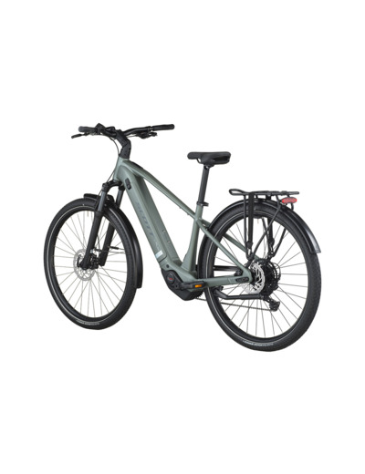 Le vélo dispose d’une fourche SR Suntour avec débattement de 100 mm pour absorber les irrégularités de la route. Il est également équipé d’éclairages avant et arrière Lezyne performants, de garde-boues Curana et d’un porte-bagage Racktime SnapIt 2.0 capable de supporter jusqu’à 25 kg, pour un usage pratique et sûr en ville.