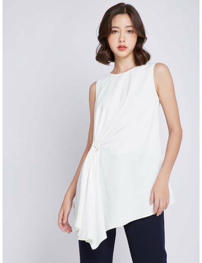 This blouse features a relaxed fit and a round neckline that flatters all body types, while the asymmetric hem and side tie detail add a modern edge. Side slits and long length enhance movement and layering options, making it perfect for busy days at the office or casual outings. The sleeveless design keeps you cool and polished throughout the day.